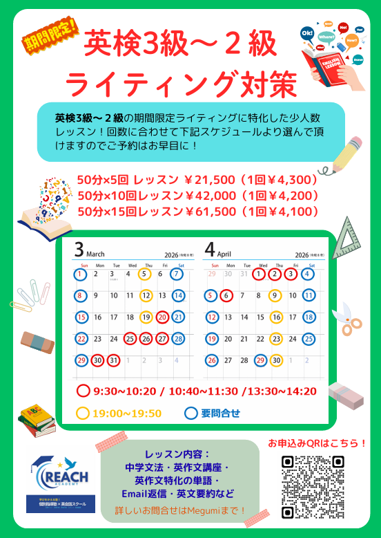 今日はREACH ACADEMY 英会話スクールで得意とするライティング対策のお知らせです。