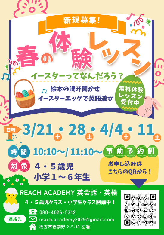 【枚方市・西禁野】小学生からはじめる英会話+児童英検! 中学生まで一貫指導のREACH ACADEMY 英会話 - 英検対策・2次面接・TOEFL・IELTS・留学英語・英会話