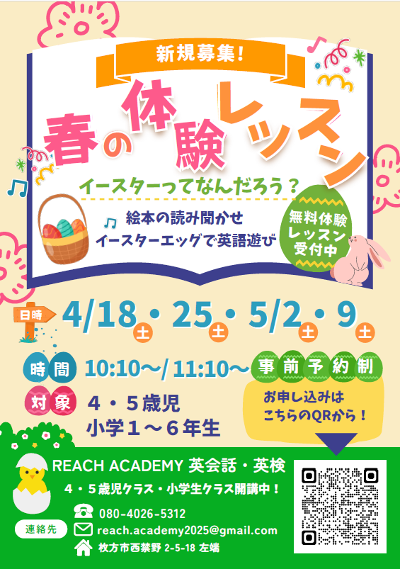 【春はスタートのベストタイミング】4・5歳児から小学生まで!枚方市・西禁野のREACH ACADEMY 英会話スクール - 英検対策・2次面接・TOEIC・TOEFL・IELTS・留学英語・英会話